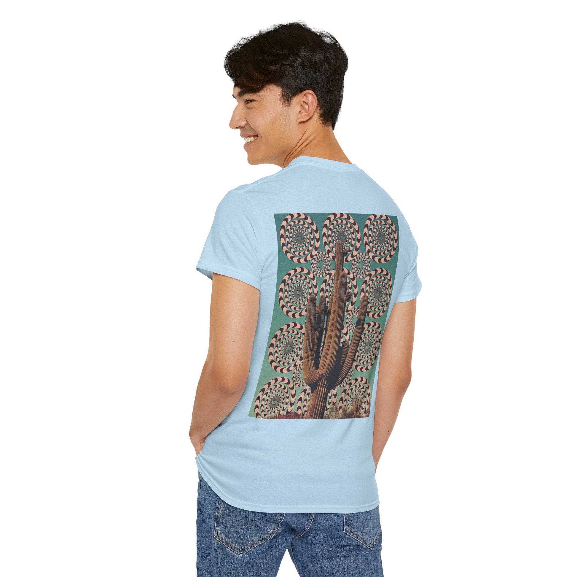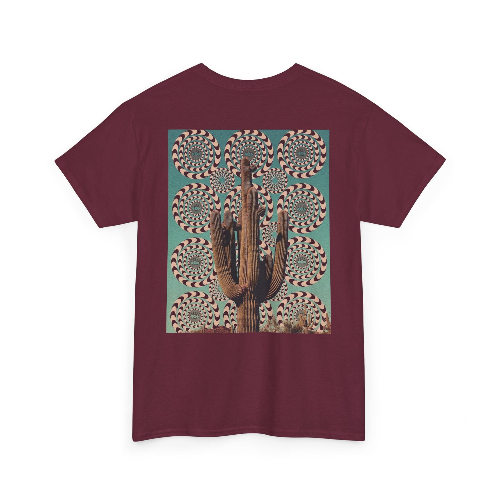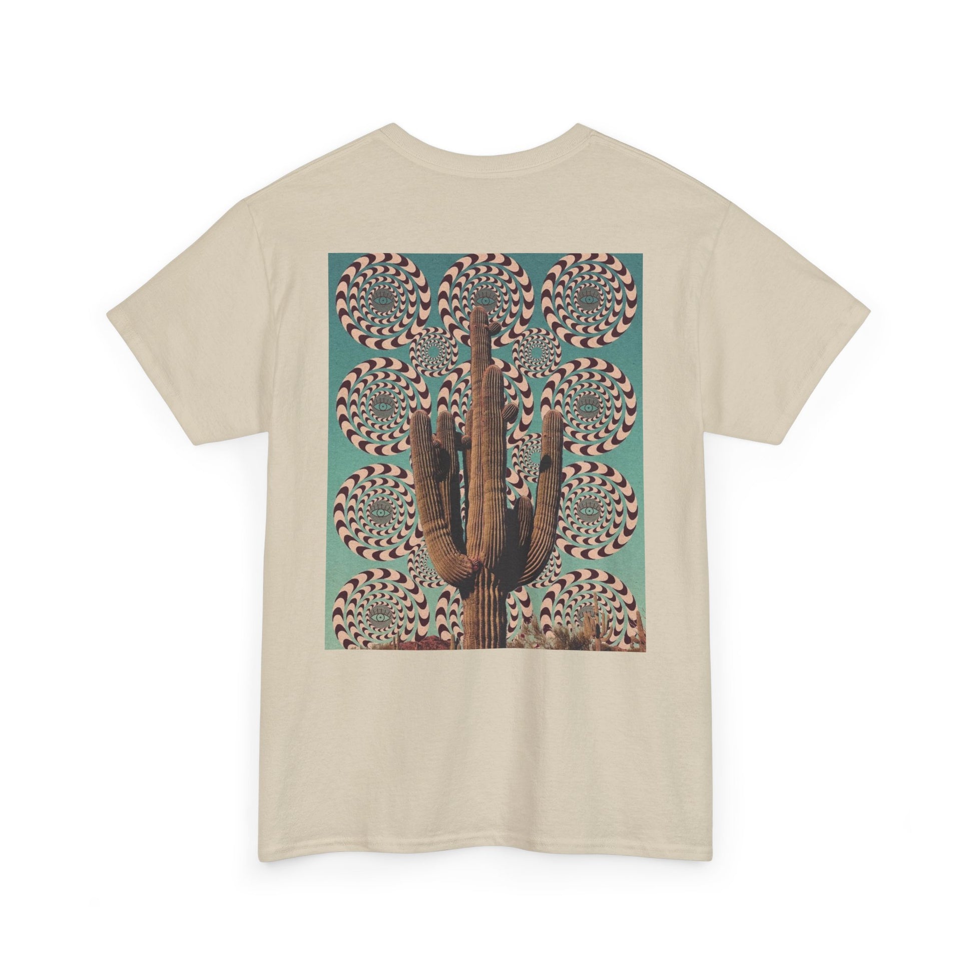 A mystical and Southwest aesthetic design featuring cacti and an eye, perfect for those who love unique and artistic pieces. This tee offers a classic fit for comfortable wear and can be styled for casual or semi-formal occasions. Ideal for adults looking for a sustainable and durable shirt with crisp, detailed prints.